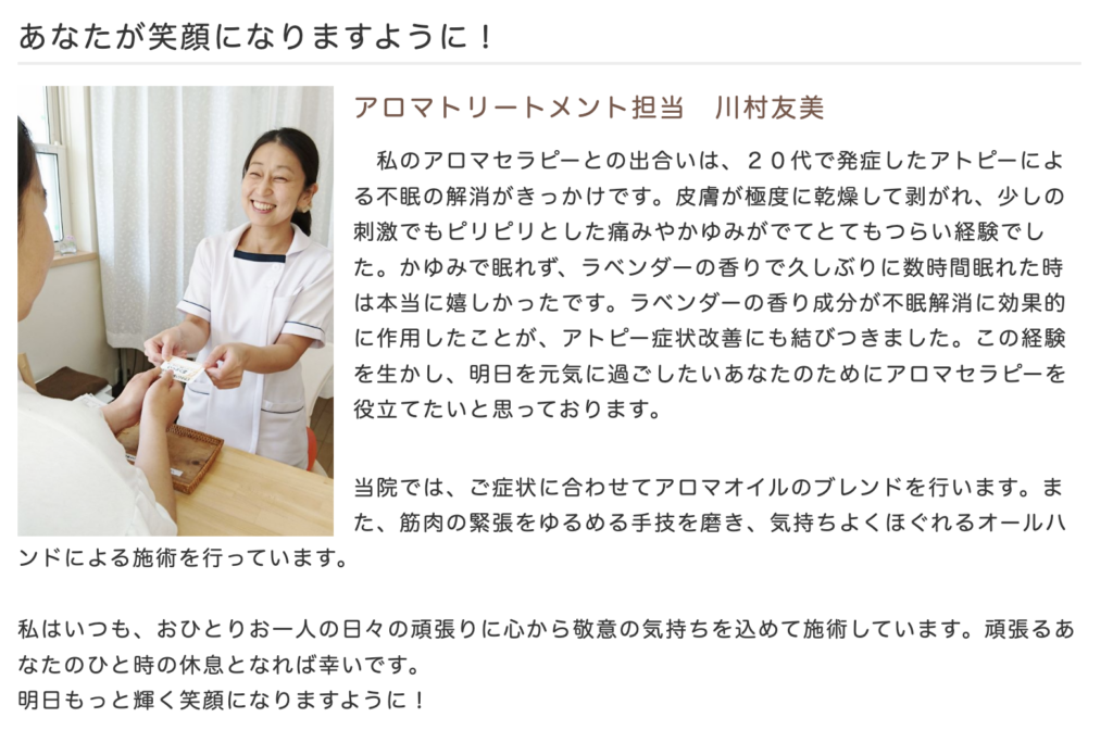 施術室は個室になっています。毎回、施術ベッドや枕の消毒を徹底し、安心してリラックスできるように心がけています。小さなお子様連れの方は、お子様と同室で施術を受けることができるようにアロマルームへご案内いたします。施術着のご用意もございますので、スーツやスカートでご来院されても安心です。